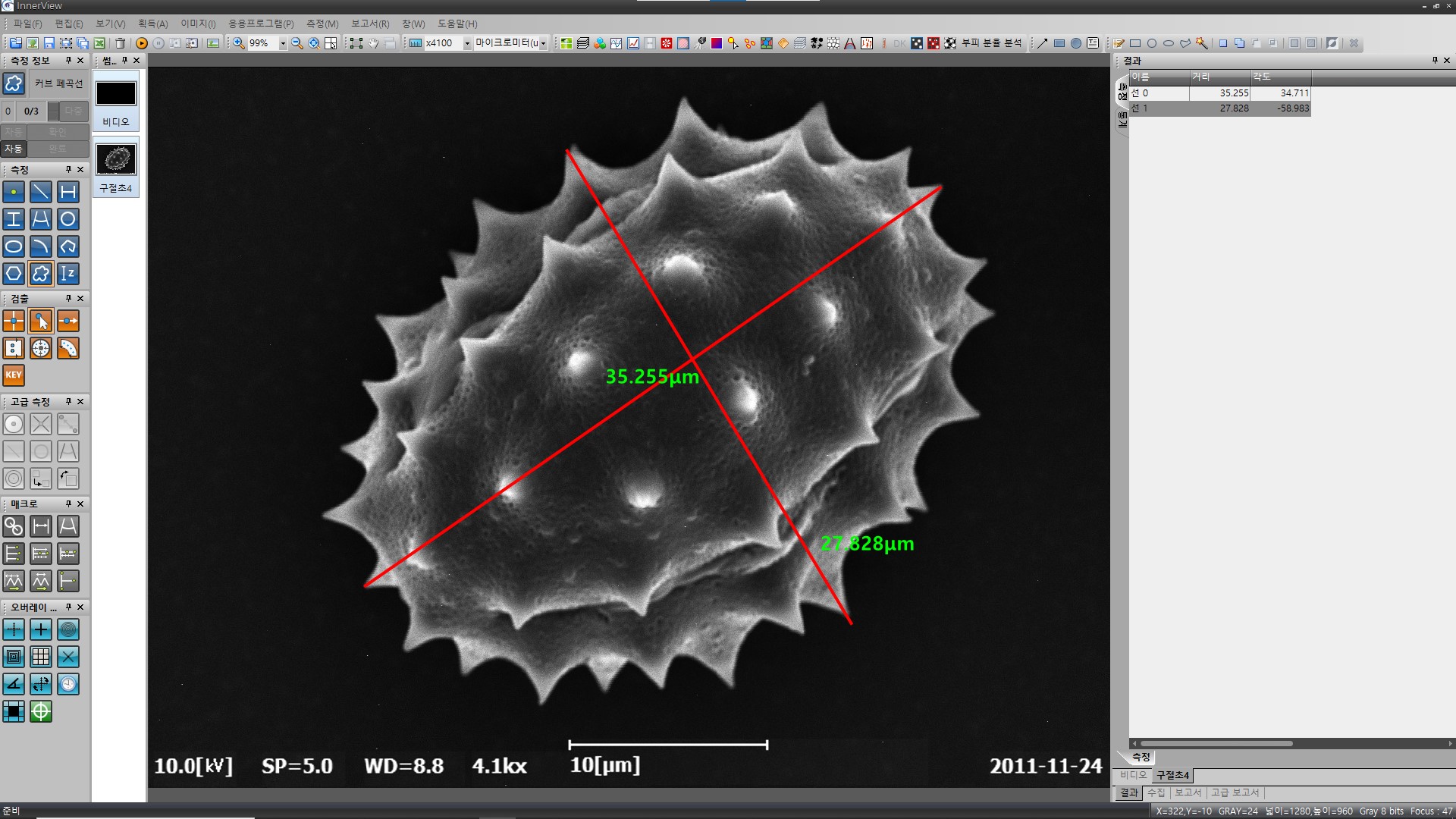 InnerView™에서는 다양하면서 빠르고 정밀한 Thershold 기능을 이용하여 이미지 내 개체를 빠르고 정확하게 추출, 측정, 분석할 수 있는 도구를 제공합니다. 수십여가지의 측정 항목을 제공하며, 측정 개체의 분류, 통계 데이터 산출, 그래프 출력등을 빠른 시간내에 수행 할 수 있습니다.